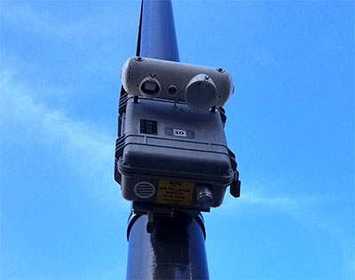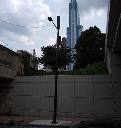 Air quality monitoring devices like this one at 18th and Vine started to appear in Philadelphia in early 2020. At the time of this posting, 50 of these devices have been installed within the city. Some units show markings for NYC, possibly indicating that these were used within New York or are surplus.