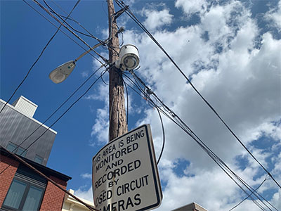 The Philadelphia Police Department has a few surveillance cameras like this one at 15th and Latona. Thought to deter drug activity and other crime, these cameras have been in place since at least 2009 and automatically follow detected movement. It is unknown if anyone is currently monitoring this footage, or if these cameras are functional.