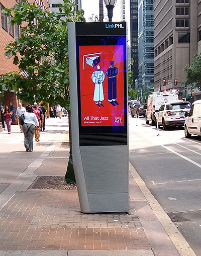 Pronounced "Link Philly," these 9.5-foot obelisks provide free WiFI access, mobile device charging, phone calls, access to municipal and emergency services, maps and directions, and information for community events. They are created by the company Intersection (previously Titan), with investment from Google parent Alphabet. Each LinkPHL kiosk has three cameras, and microphones, among other sensors.