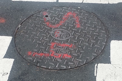 Sometimes you'll see a manhole cover that is surrounded with colorful markings. Whenever a contractor or construction company plans to do street excavation, utility companies will mark out the location of their underground cables so that the contractor knows to watch out for them.