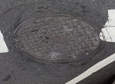This peculiar "TELEPHONE" manhole cover is likely a replacement for a damaged Bell Telephone Company manhole cover.
