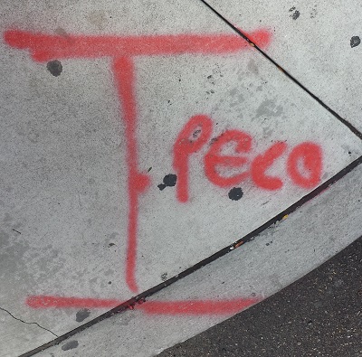 Here is a great marking for PECO in red (the standard color for electrical runs). Notice the capital "I" symbol next do it denoting the width of the conduit containing the cables. For more info on PECO, check out the manhole entry.
